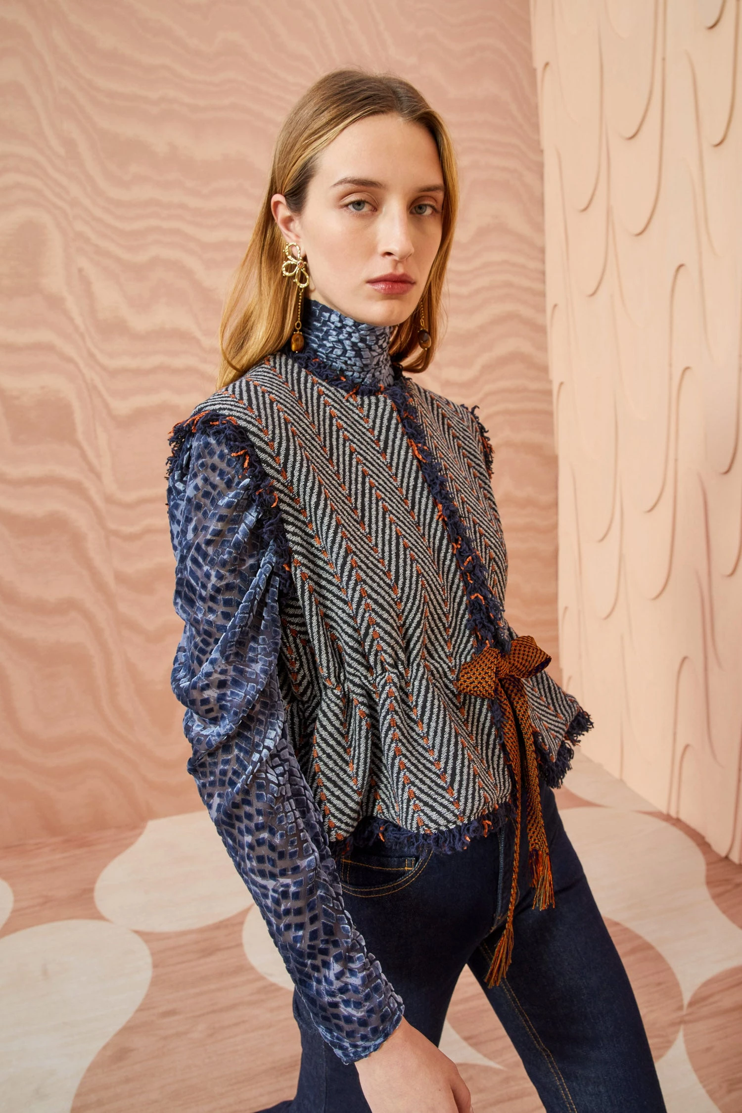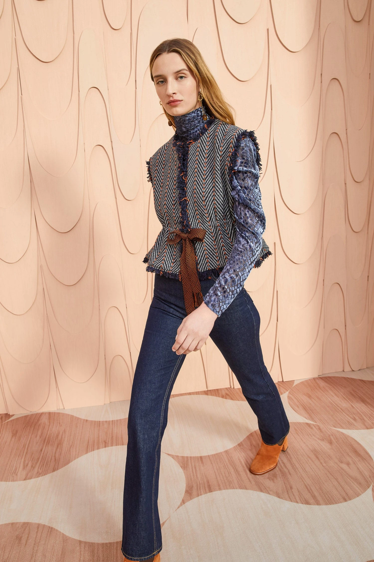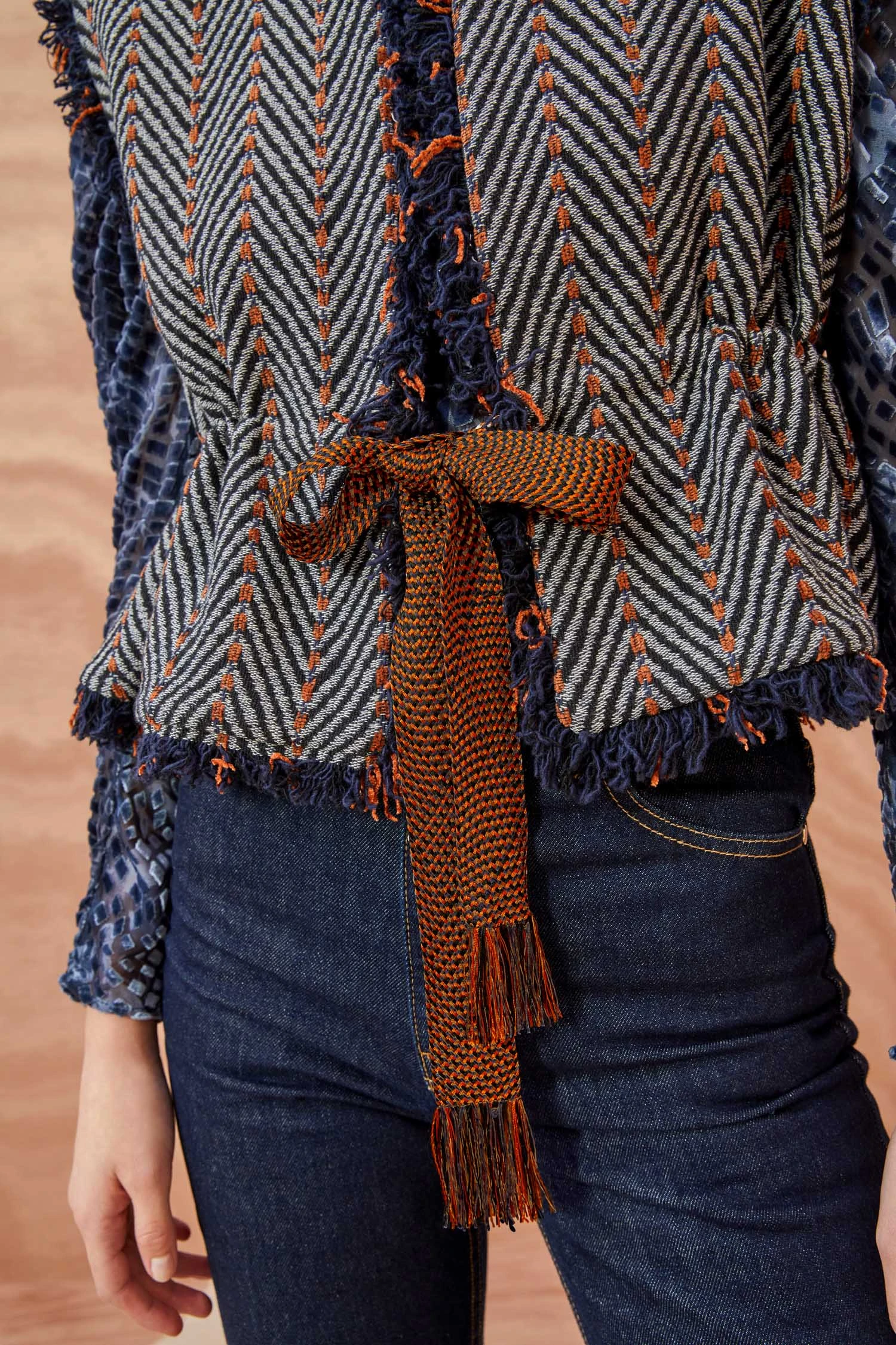 Our Clyde Vest is beautifully made from our Italian herringbone tweed fabrication in a smokey gray, blue, and orange colorway. This collarless, sleeveless style is adorned with contrast chenille stitching, fringe trims, and fastens with a woven ribbon at the waist.