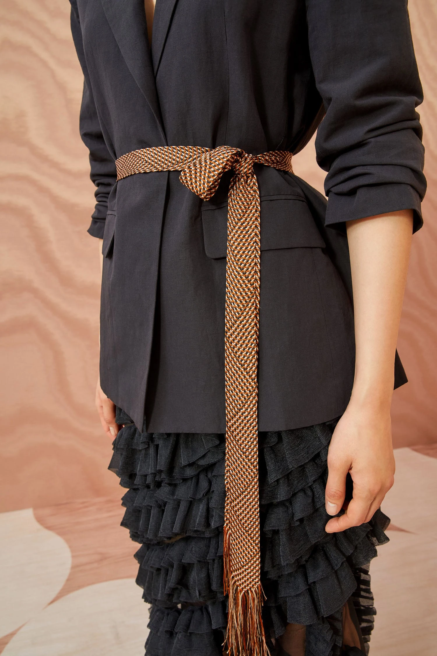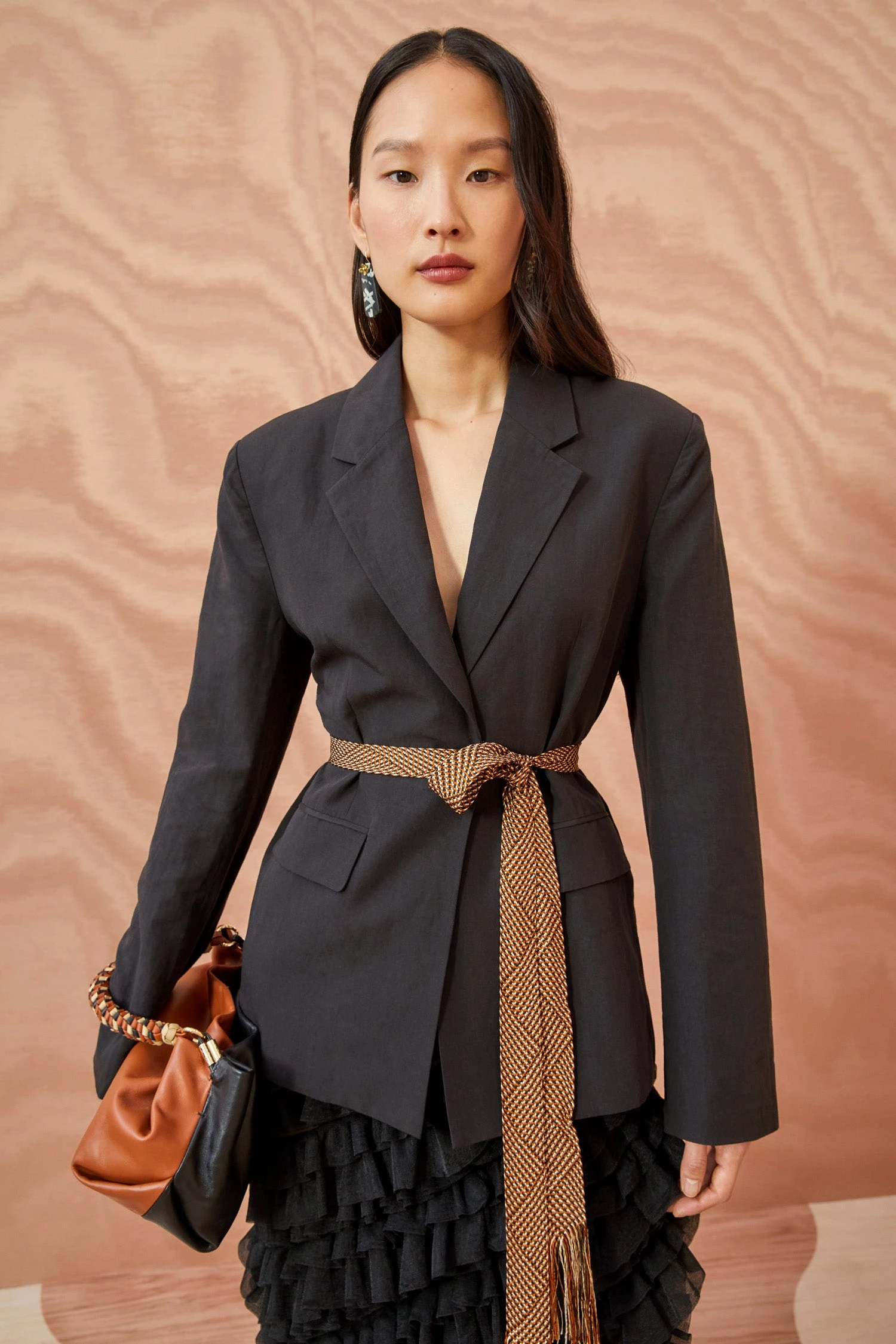 As featured in Look 17 of our Autumn/Winter ’23 Runway Show, the Ellery Jacket is crafted from our luxurious slub suiting made from a cotton, linen, and silk blend. This jacket in timeless black is designed with a slim sleeve and has a contrast ribbon belt that creates a cinched waist.