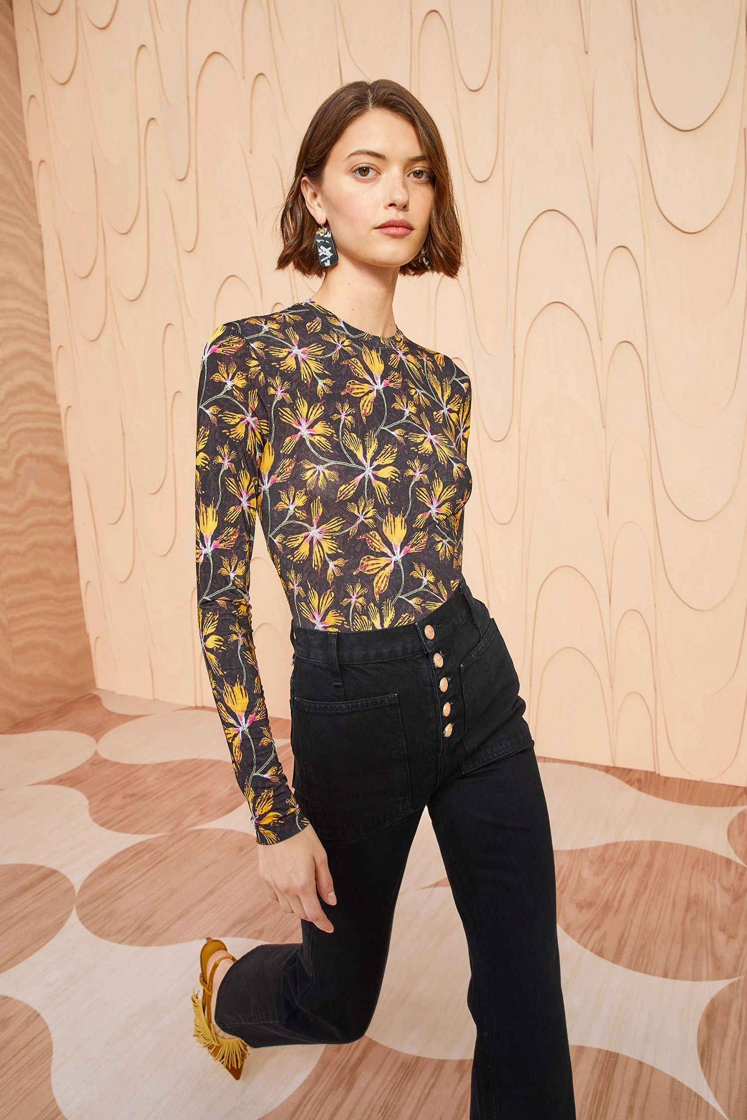 An Ulla Johnson forever-favorite, the Eve Top is reimagined for Autumn/Winter ’23 in our signature lightweight tricot jersey. This body-skimming crewneck top features a black base with vibrant yellow and pink florals. This versatile, long-sleeved top is a wardrobe essential for every season.