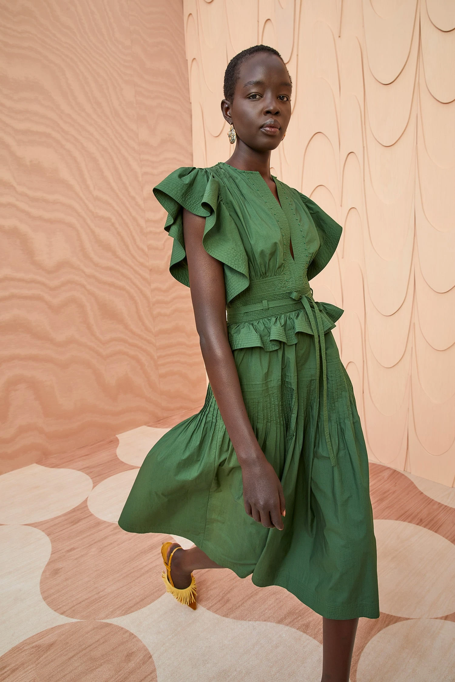 The Florence Dress is a gorgeous silhouette crafted from our best-loved water washed poplin in a rich juniper green. This midi dress features voluminous ruffles at the short sleeves and waist, hand-embroidered French knots, and lovely pintucking at the skirt. It is finished with an optional tie belt to cinch the waist and fastens with a hidden side-seam zipper.