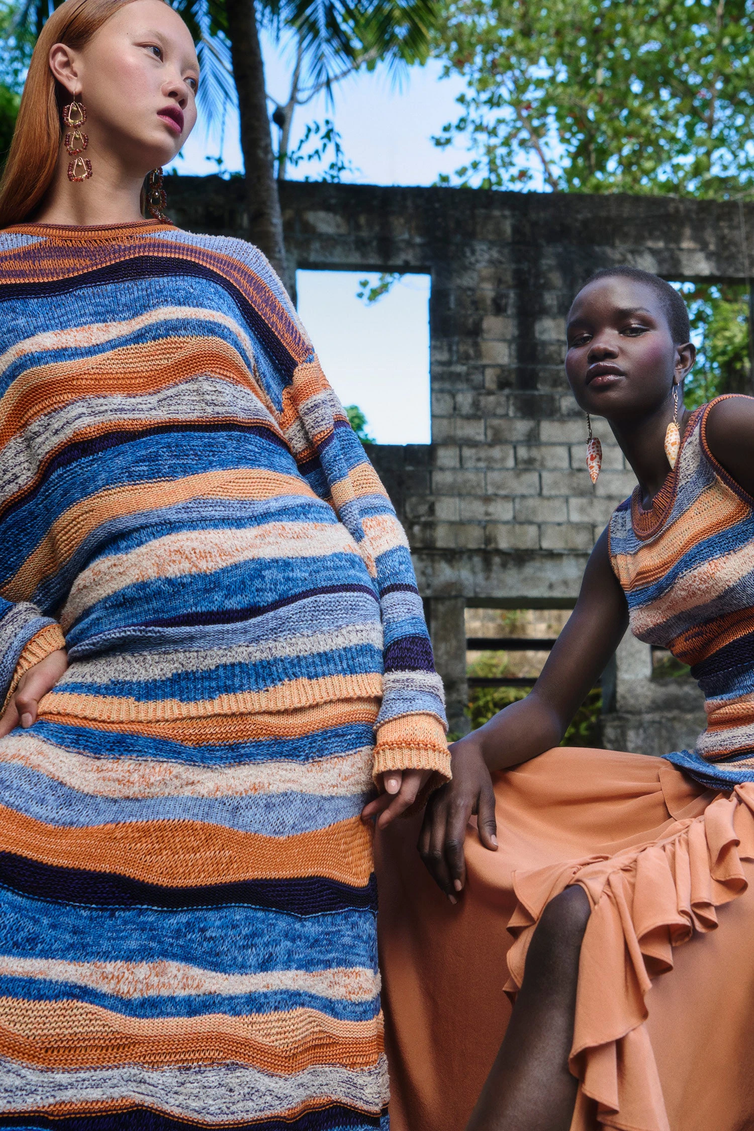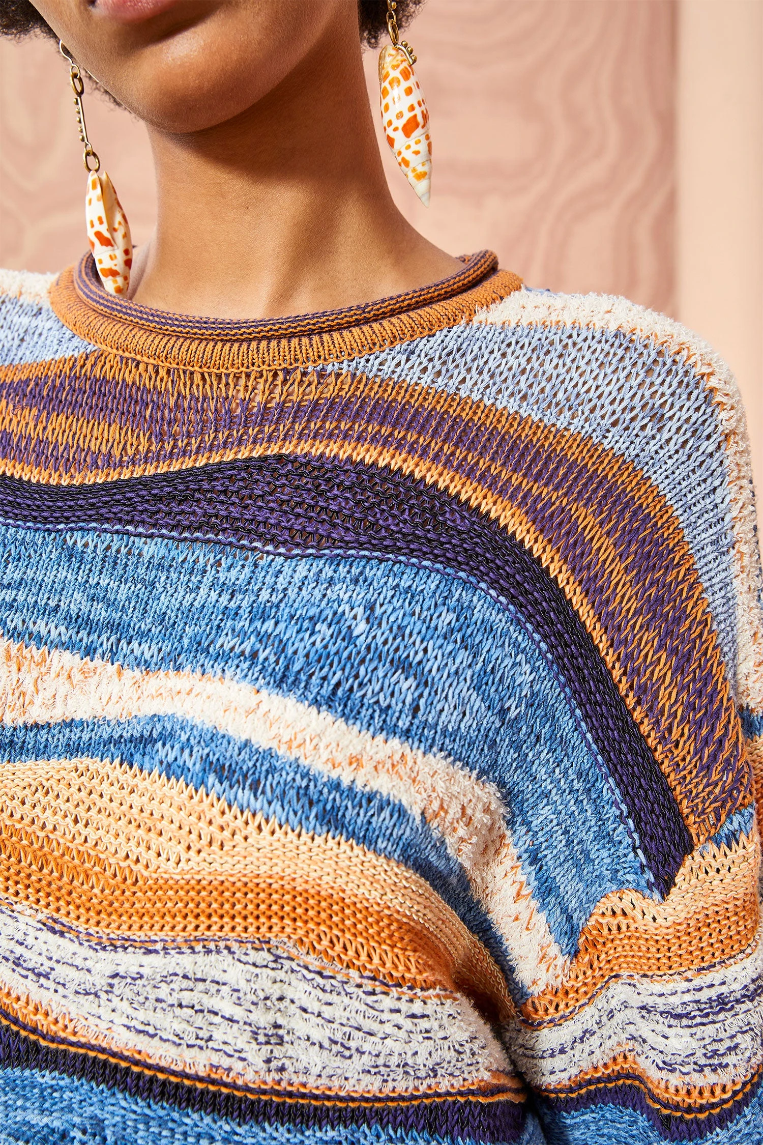 As featured in Look 13 of our Pre-Fall ’23 Lookbook, the Francie Pullover is designed in our prismatic wave cotton drop-stitch that features painterly stripes in wavy organic forms. This blue and peach graphic knit features dropped shoulders, simple crewneck, and an oversized silhouette.