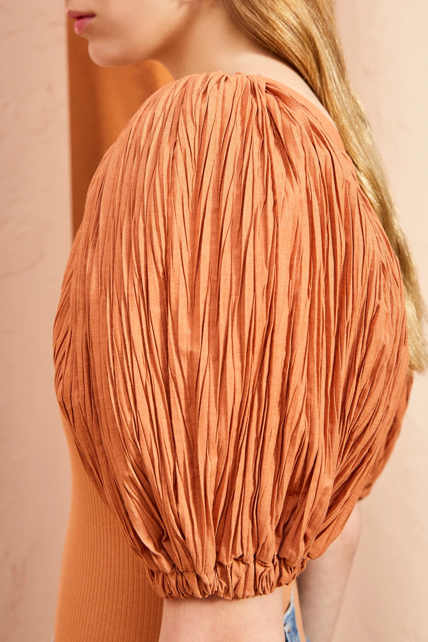 The Marika Top was created by mixing two sumptuous fabrics together. Its body-skimming bodice is made from our ultra-fine ribbed knit, while its short puff sleeves have been crafted from our signature pleated poplin, adding lightweight sculptural dimension. This ethereal orange blouse is adorned with three delicate buttons.
