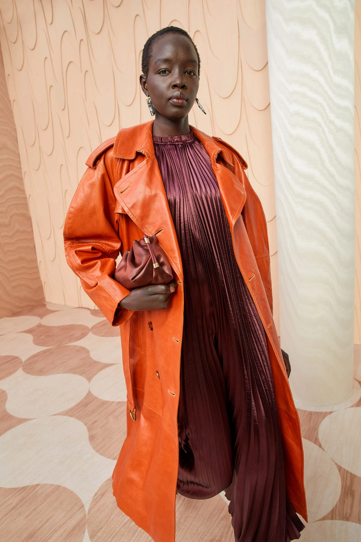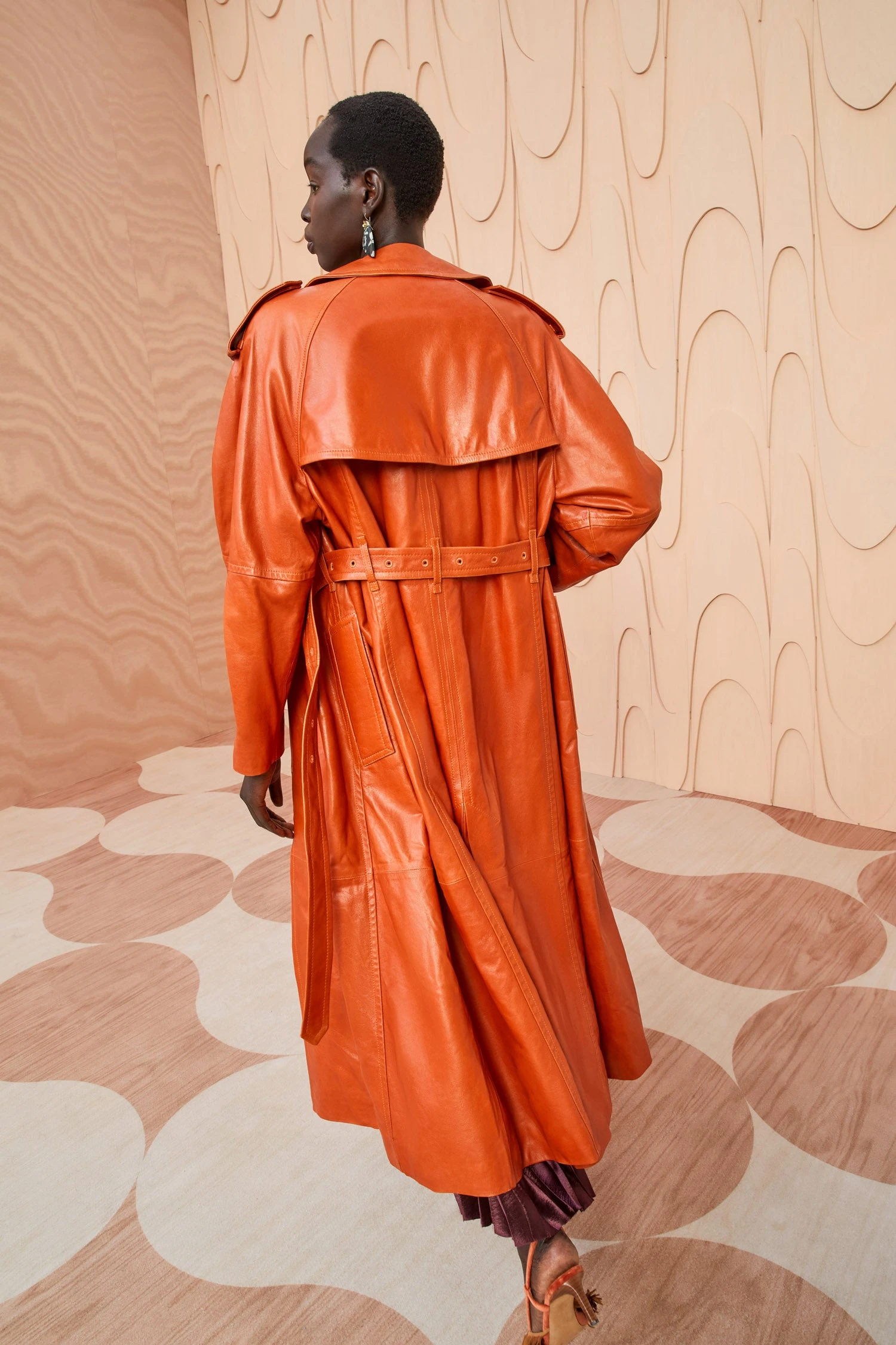 As featured in Look 5 of our Autumn/Winter ’23 Runway Show, the Marlowe Coat is made from a lustrous waxed leather with a slightly crackled surface texture. This gorgeous sierra brown trench coat features a nipped waist and classic utilitarian-style details.