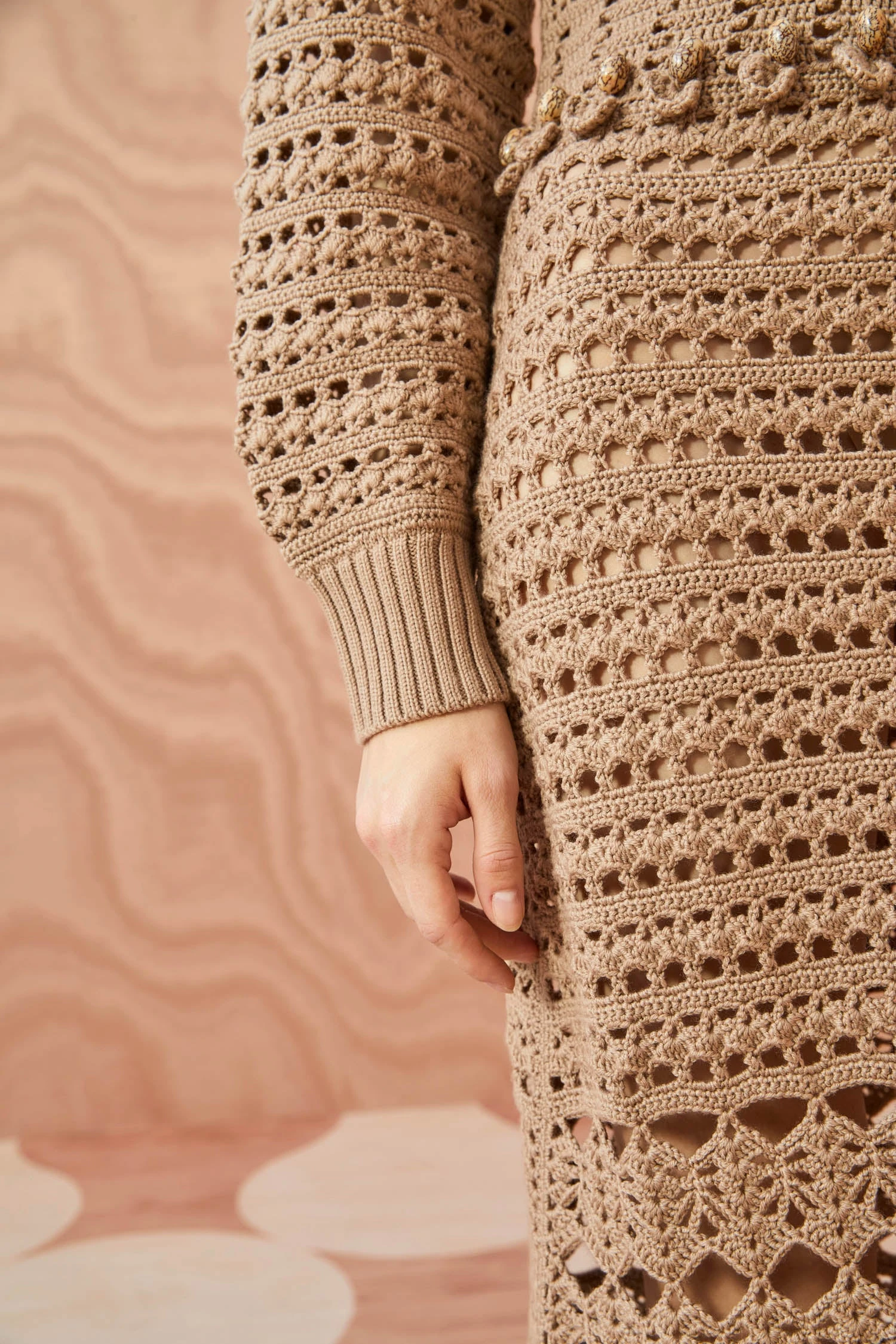 As featured in Look 47 of our Autumn/Winter ’23 Runway Show, the Prisha Dress is made from Italian-spun merino wool that is hand-crocheted into lattice-like stitches, alternating patterns along its length. This beige dress sits close to the body, has full sleeves, and is adorned with small wooden beads.