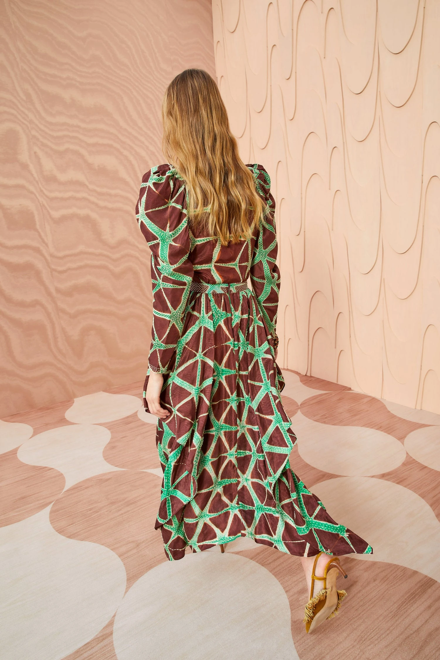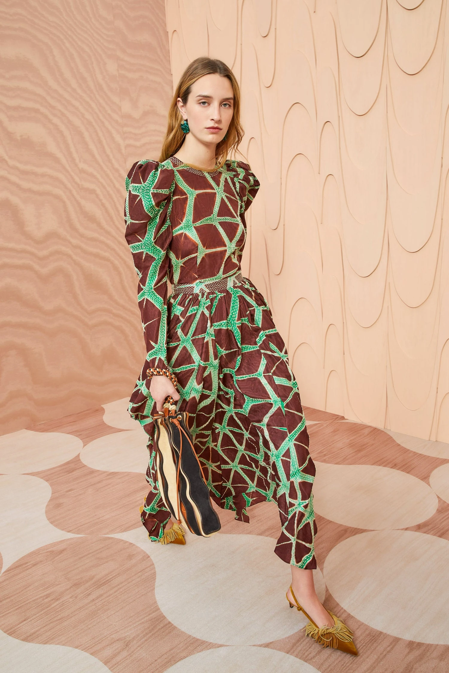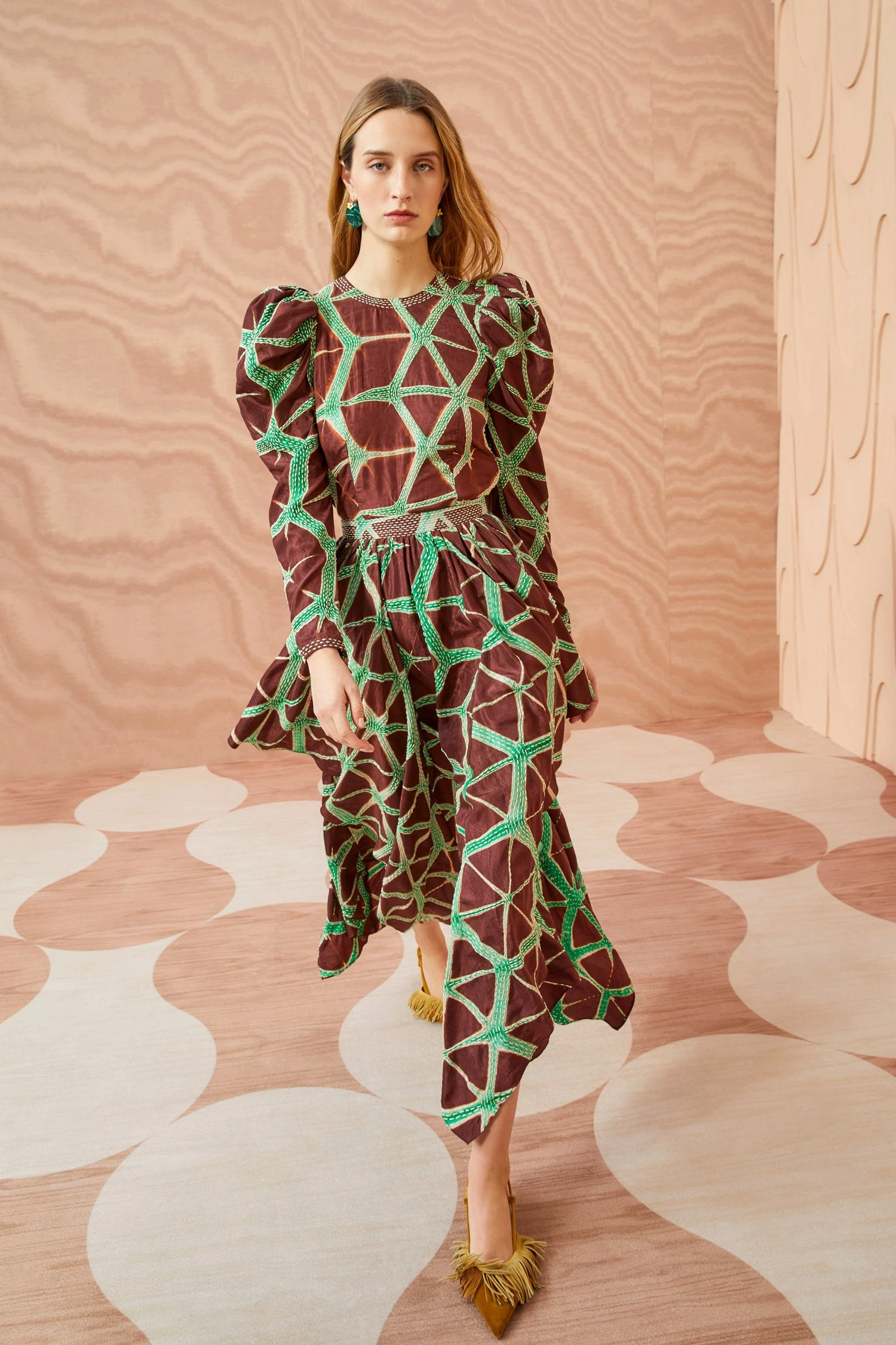 As featured in Look 3 of our Autumn/Winter ’23 Runway Show, the Savita Skirt is handcrafted from silk by a collective of women in Bangalore using an intricate technique. This process creates beautifully prismatic patterns which have also been adorned with contrast hand-stitching, ensuring each piece is unique. This flouncing midi-length skirt is finished with cascading ruffles down each side, a fixed waistband, and a zipper down the back.