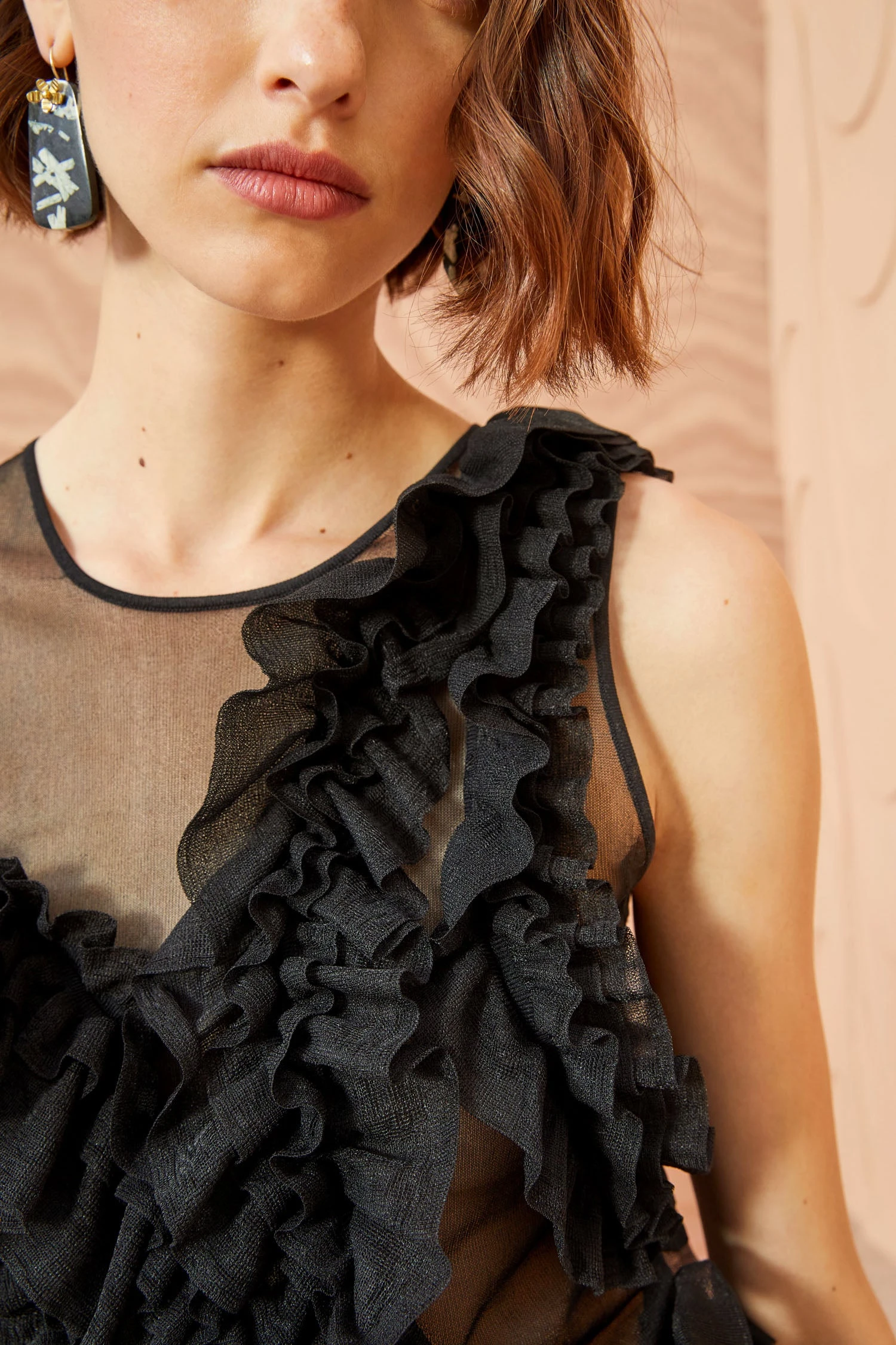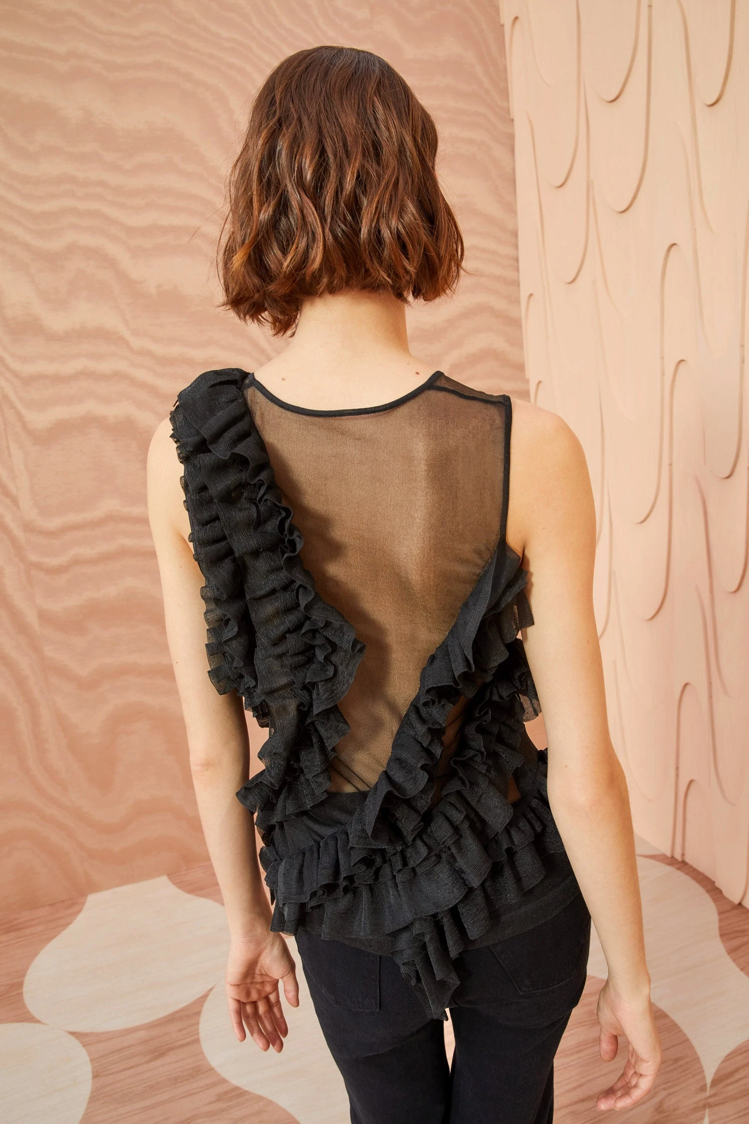 As featured in Look 38 of our Autumn/Winter ’23 Runway Show, the Winnifred Top is made from our translucent frills knit, a sheer top adorned with a strategically placed explosion of fluttering frills across the bodice. Pair this black sleeveless top with the Sarafina Skirt for the full look.
