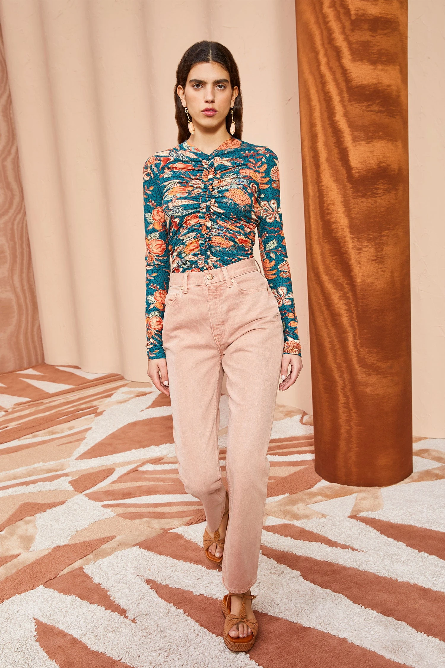 The Wren Top is crafted from our finest tissue-thin cotton jersey, featuring our wild hibiscus print with bold florals accented by pops of turquoise and coral. This long-sleeved shirt fits close to the body and is defined by a ruched center-front seam.